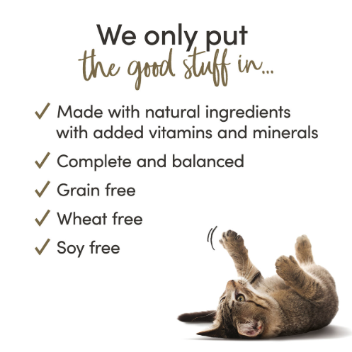 - 80%:n liha- ja kalapitoisuus: ravitsevaa eläinproteiinia, jota kissat hyödyntävät tehokkaasti