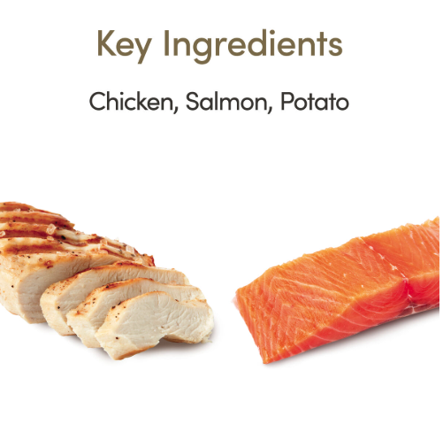 kanajauho 40%, peruna*, lohi 9,5% (tuore lohi* 5,5%, lohijauho 4%), siipikarjan rasva 8%, vitamiinit ja mineraalit, sokerijuurikkaan puristemassa*, siipikarjakastike 1,5%, lohiöljy 0.5%, kananmunajauhe*, kuivattu oluthiiva*, sikurijuuriuute* 0,2% (Prebioottisen FOS:n lähde), merilevä*, Yucca-uute*, karpalojauhe. *luonnolliset ainesosat.