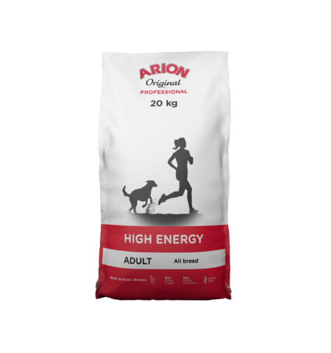 Arion HIGH ENERGY kana on gluteeniton ja vehnätön, kanapohjainen täysravinto aikuisille koirille. Se on täydellinen valinta aktiivisille koirille. Ravinnossa on korkea kaloripitoisuus (4600 kcal/kg) ja se sisältää runsaasti eläinperäisiä proteiineja. Ravinto on erityisesti valmistettu vastamaan aktiivisen koiran ravitsemuksellisia tarpeita. HIGH ENERGY -täysravinto tarjoaa aktiivisen koiran tarvitsemaa ylimääräistä polttoainetta ja parantaa koiran kestävyyttä sopien näin erinomaisesti aktiivisille, työskenteleville, imettäville ja toipuville koirille.