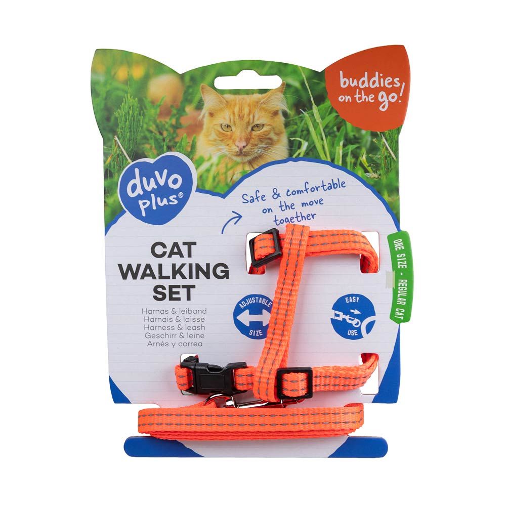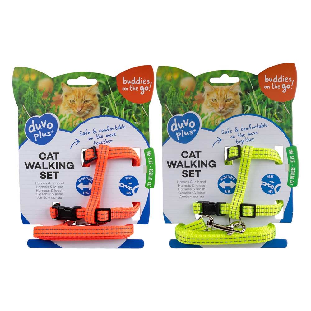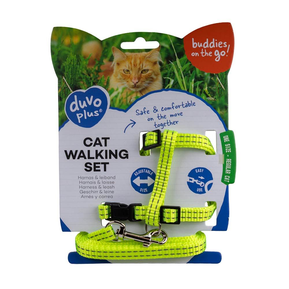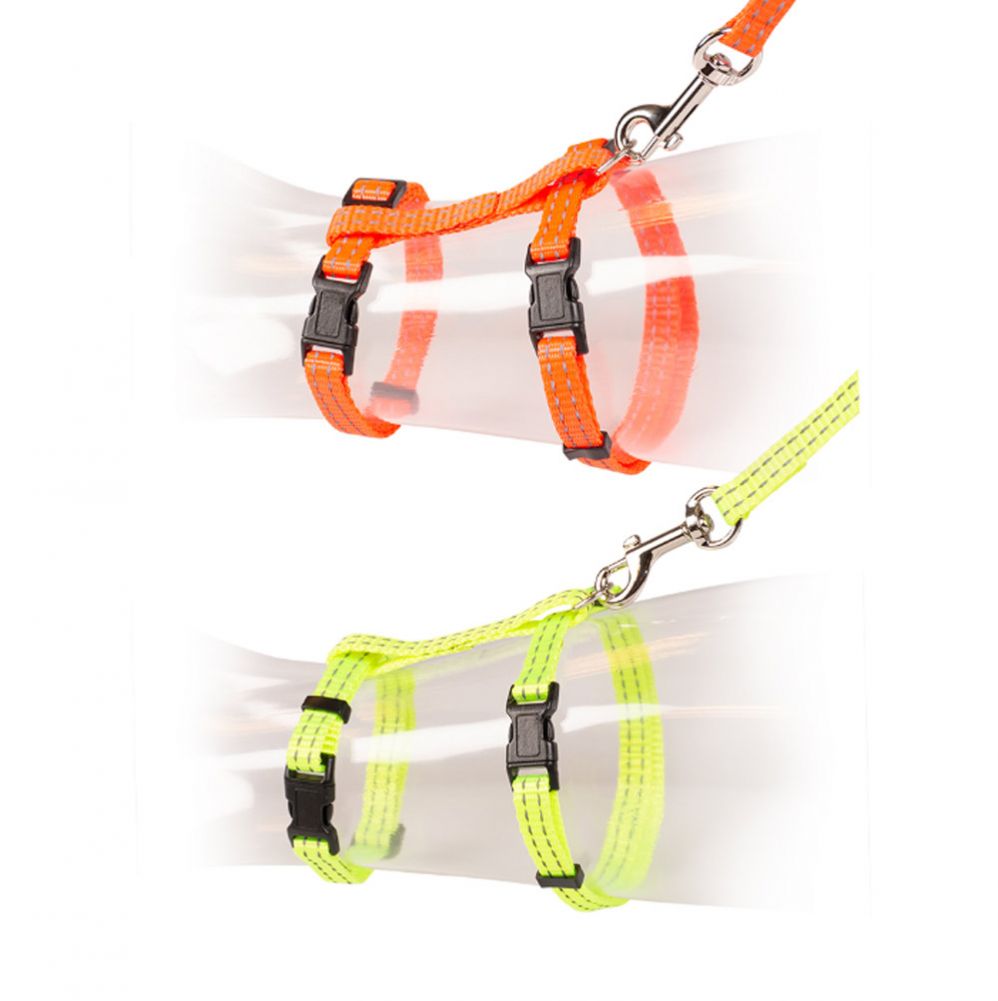 Säädettävä, pikalukoilla varusteltu, huomiovärinen heijastava valjassetti kissalle tai pienelle koiralle. Taluttimessa kevyt metallinen liipasinlukko.