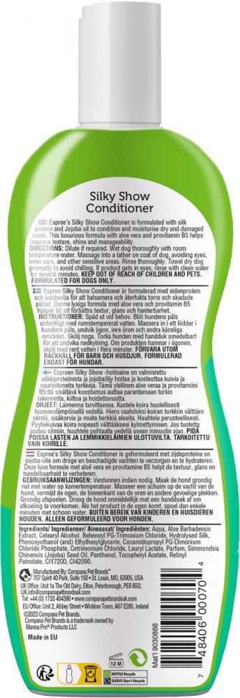 Espree Silky Show -hoitoaine antaa koirasi turkille silkkisen pehmeän ja kiiltävän lopputuloksen.Edistynyt koostumus on rikastettu luonnollisilla ainesosilla, kuten silkkiproteiineilla ja aloe veralla, jotka yhdessä pehmentävät, kosteuttavat ja vahvistavat turkkia. Silkkiproteiinit tunkeutuvat syvälle karvan rakenteeseen tehden siitä sileän ja kiiltävän, kun taas aloe vera kosteuttaa ja rauhoittaa ihoa.