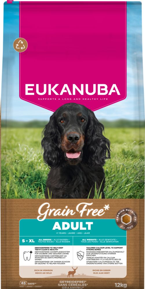 - Eukanuba Grain Free -koiranruoka aikuisille, kaikenkokoisille ja -rotuisille koirille sisältää runsaasti tuorepakastettua hirvenlihaa, joka auttaa ylläpitämään koiran lihaskuntoa.