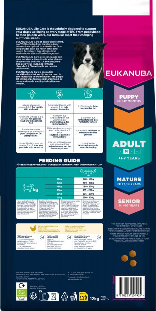 Eukanuba-kuivaruoka sisältää runsaasti tuoretta kanaa ja sopii erinomaisesti keskikokoisten rotujen aikuisille 1-7-vuotiaille koirille. Eukanuba-kuivaruoan sisältämä L-karnitiini tukee kehon rasvan vähenemistä ja auttaa koiraasi ylläpitämään optimaalista painoa, mikä vähentää nivelten rasitusta. Prebioottisen FOS-kuidun ja juurikasmassan räätälöity kuitusekoitus edistää terveellistä ruoansulatusta.Kuivattu kana ja kalkkuna (23% sisältää kana 14%, luonnollinen lähde glukosamiini, kondroitiinisulfaatti ja tauriini), tuore kana (17%), maissi, vehnä, kananrasva, ohra, durra, kaura, kuivattu juurikasmassa (3%), kanakastike, kalajauho (luonnollinen lähde omega-3-rasvahapot), kivennäisaineet (sisältää natriumheksametafosfaatti 0.34% ), kokonainen kuivattu kananmuna, frukto-oligosakkaridit (0.25%, luonnollinen prebiootti).