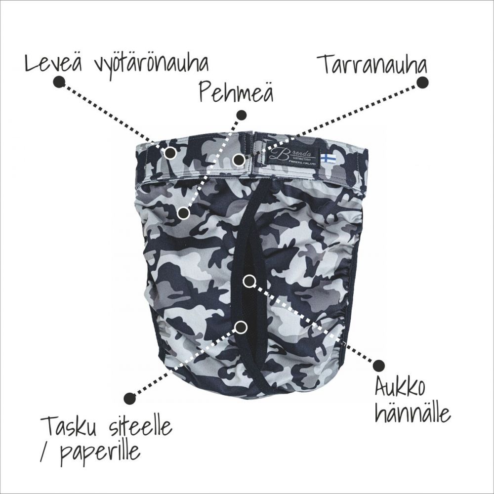 - Leveä vyötärökaitale ja tarrakiinnitys pitävät housut tukevasti jalassa