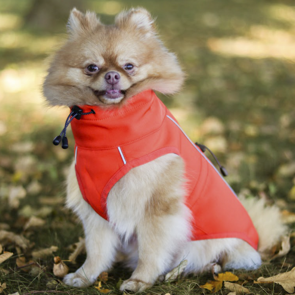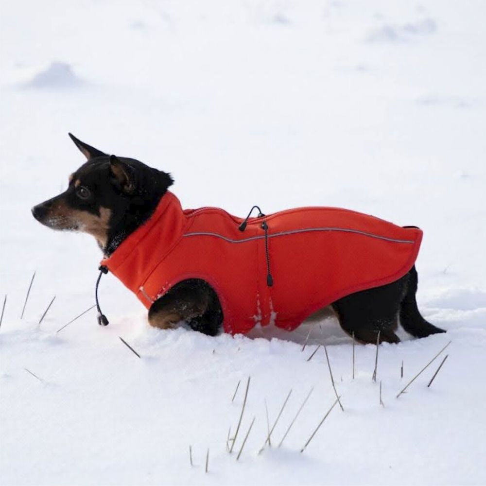 FINNERO SPORT softshell-takki on loistava valinta koiran ulkoiluun. Sateelta ja tuulelta suojaavassa takissa on pehmeä fleecevuori, joka lämmittää suuret lihasryhmät; selän, rinnan ja reisilihaksia. Kaulus suojaa niskaa ja sitä voidaan säätää sopivaksi joustavalla heijastimellisella nyörillä. Vatsakappale lämmittää niin rintakehää kuin vatsaakin, jossa on lisänä pieni joustava kiristys. Pukeminen on nopeaa ja vaivatonta, sillä selkäpuolen vetoketju aukeaa kokonaan.