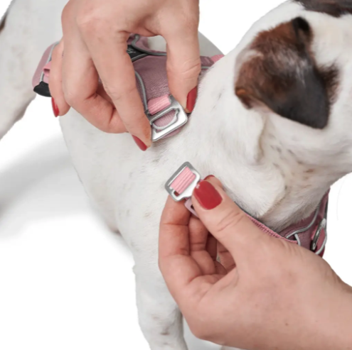- Kaksi D-lenkkiä talutushihnan kiinnittämiseksi valjaiden selkäosaan ja / tai rintaan