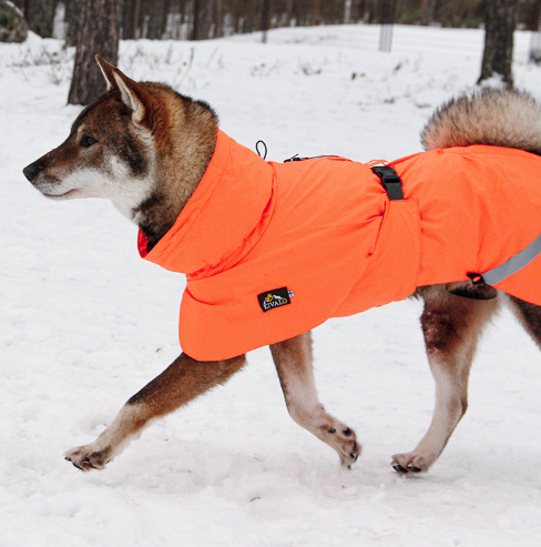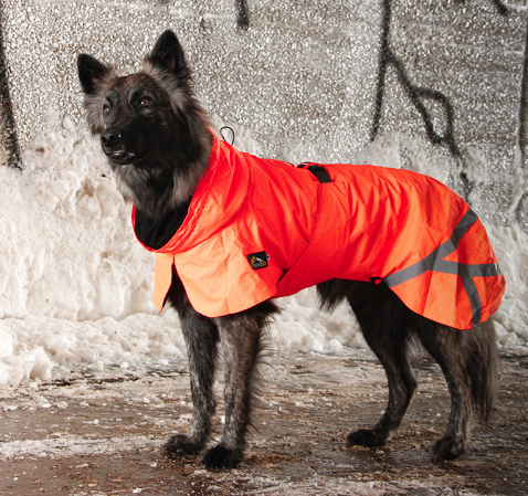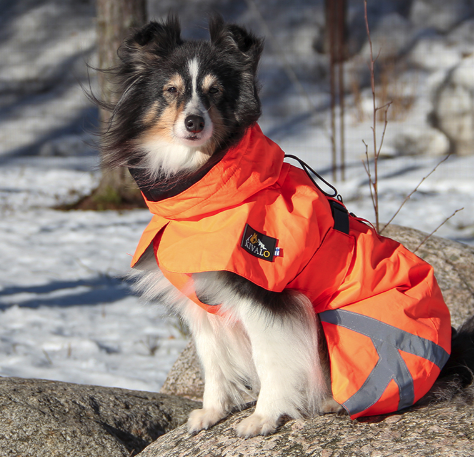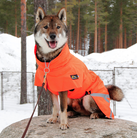 Hyvä takki on istuva ja mahdollistaa normaalin liikkeen - kuin koiralla ei olisi takkia lainkaan! Kivalo Ohto suojaa kauttaaltaan koiran rungon niskasta häntään, jolloin herkimmät kehonosat pysyvät kuivina ja vilu ja joillekin koirille varsin ikävä "märkä tunne" ei ota valtaa. Helmassa on pituutta niin edessä kuin takana, jolloin vesi valuu maahan suojaten kastumiselta tärkeät raajojen suuret lihakset. Rintakehää suojaa oma kappaleensa, joka kiinnittyy vyöllä selän päälle.
