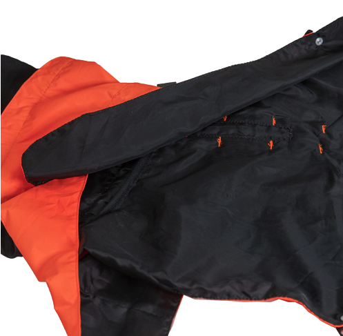 Takin korkeassa, suojaavassa kauluksessa on kuminauhakiristys. Kauluksen sisällä on toinen, trikookankaasta valmistettu huppu, joka voidaan halutessa vetää koiran pään ja korvien suojaksi tai kiristää ulomman kauluksen sisään eristäväksi tuulisuluksi. Takajalkojen ympärillä kulkee leveät reikäkuminauhat, jotka voidaan halutessa kiinnittää myös ristiin, jolloin takki pysyy paikoillaan ja suojaa entistä paremmin. Kuminauhat voidaan tarvittaessa myös irrottaa kokonaan.