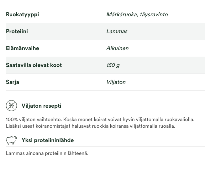 Lammas 60 % (liha, keuhkot, pötsi, sydän, maksa, valkuainen), kivennäisaineet.
