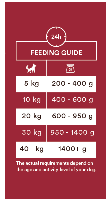 Jokainen koira on yksilö ja energiantarve vaihtelee iän ja aktiivisuustason perusteella. Jaa päiväannos kahteen päivittäiseen ateriaan ja pidä aina puhdasta vettä saatavilla. Säilytä kuivassa ja viileässä. Parasta ennen/eräkoodi: pakkauksen pohjassa.