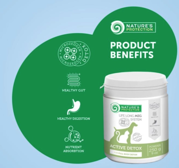 Nature's Protection Active Detox aikuisille koirille ja kissoille on erityisesti kehitetty täydennysrehu, joka on valmistettu välttämättömistä ja luonnollisista materiaaleista, mukaan lukien luonnosta peräisin olevasta; vulkaanista alkuperää oleva klinoptiloliitti - Microzeogen. Tämä täydennysrehu on suunniteltu puhdistamaan ja vahvistamaan suolen seinämiä, lievittämään myrkytyksen, oksentelun tai ripulin oireita. Sen lisäksi, että tämä rehulisä puhdistaa elimistöä kertyneistä myrkyistä, se voi auttaa parantamaan ruoansulatuskanavan toimintaa ja edistää yleistä terveyttä ja hyvinvointia.